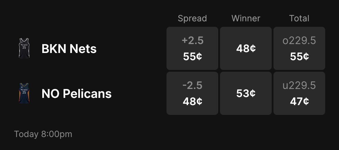 The Pelicans are 2.5-point favorites over the Nets on the spread (Pelicans -2.5), with the over/under set at 229.5 total points. New Orleans is a 53-cent favorite to win outright, while Brooklyn is priced at 48 cents to pull off the upset on Fanatics Markets.