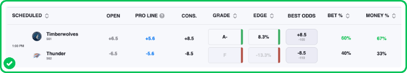 Action PRO projects the spread for this game at Thunder -5.6, suggesting that Oklahoma City is favored by almost three more points than they should be in this spot, which is a big enough edge to make Timberwolves +8.5 an A- play in our database.