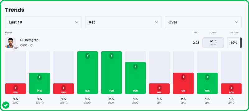 - Chet Holmgren Over 1.5 Assists (+130)