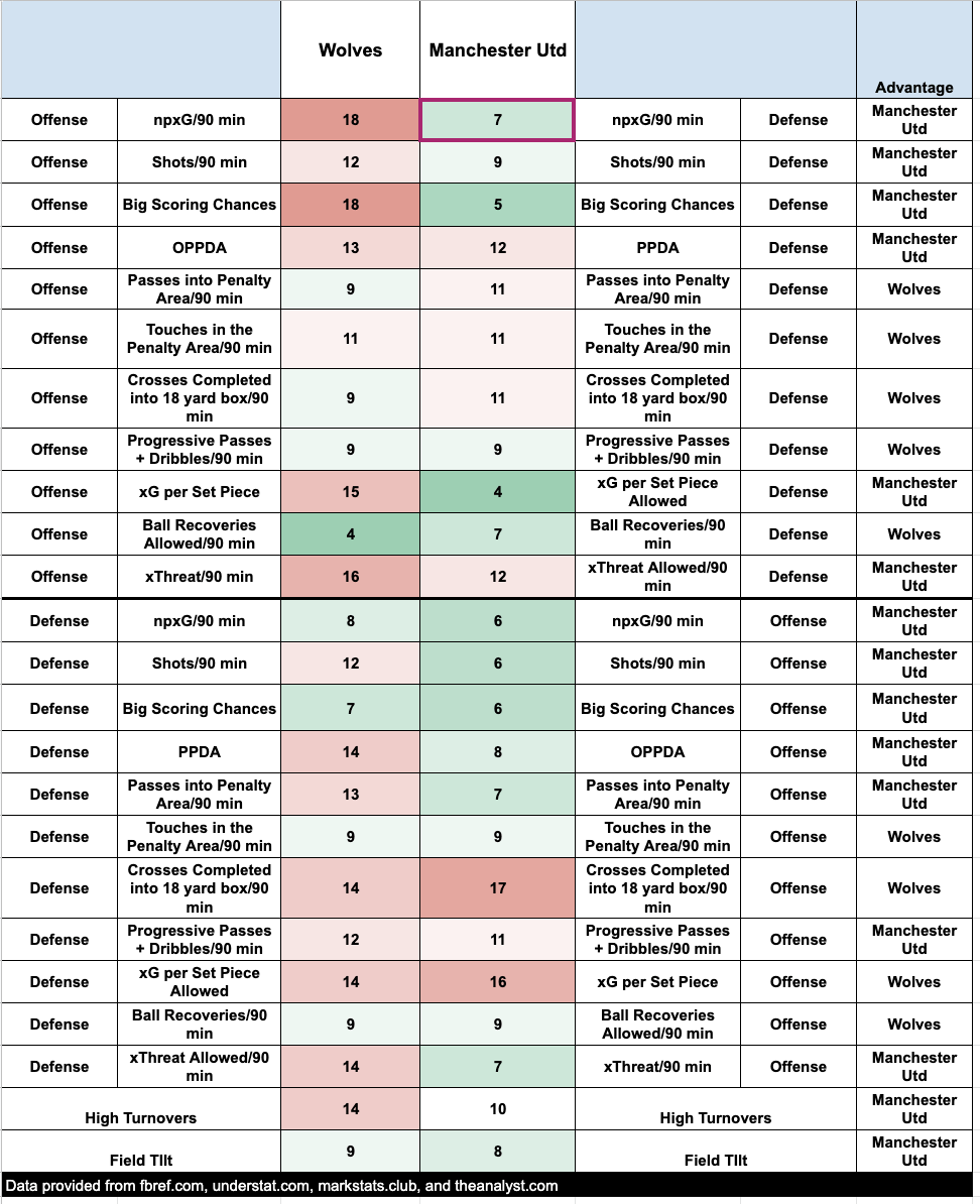 Defensively, Wolves have been solid, allowing only 1.23 npxG per 90 minutes and conceding the seventh-fewest big scoring chances. However, Wolves have conceded 6.7 expected goals in their last four matches.