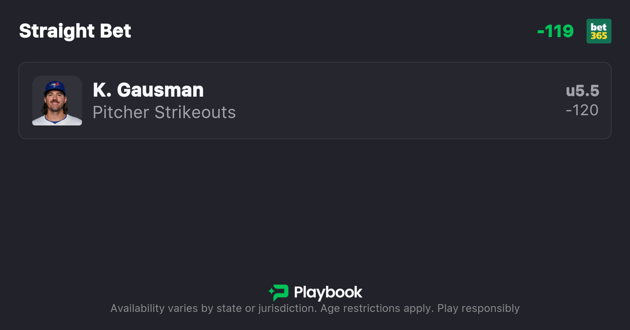 - Guardians vs Blue Jays Pick: Kevin Gausman Under 5.5 Strikeouts -120, bet365 | Play to -135