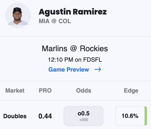 Agustin Ramirez has a hit in eight straight games and PRO projects value on his doubles prop. Ramirez is projected for 0.44 doubles in today's game, which equates to a 10.6% edge at his +300 price.