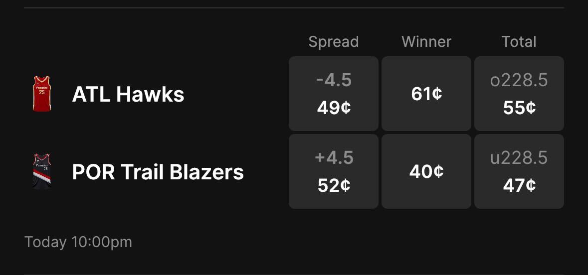 The Hawks are 4.5-point favorites over the Blazers on the spread (Hawks -4.5), with the over/under set at 228.5 total points. Atlanta is a 61-cent favorite to win outright, while Portland is priced at 40 cents to pull off the upset on Fanatics Markets.