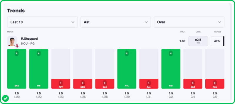 Sheppard has recorded one assist or less in six of his last eight games, despite seeing that number spike pretty high in the two games he went over during that span — finishing with 4+ assists in a pair of matchups against the Hawks and Pacers.