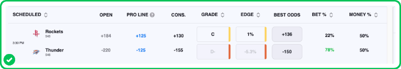 Limiting the spread percentage and the point-spread itself to a narrow band between a pick'em and 6.5 points targets matchups where the road side is clearly competitive but still priced as the less likely winner, largely because the public prefers the perceived safety of a short home favorite — and the Rockets seemingly fit the bill in this spot.