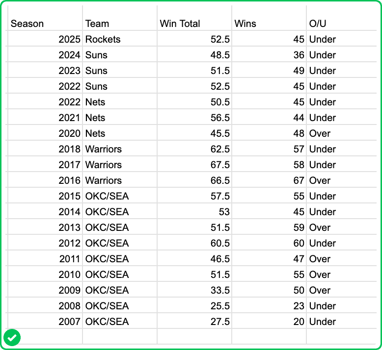 - If they go under again this season, they will have stayed under their win total all four times that it was set at 50+ during that span.
