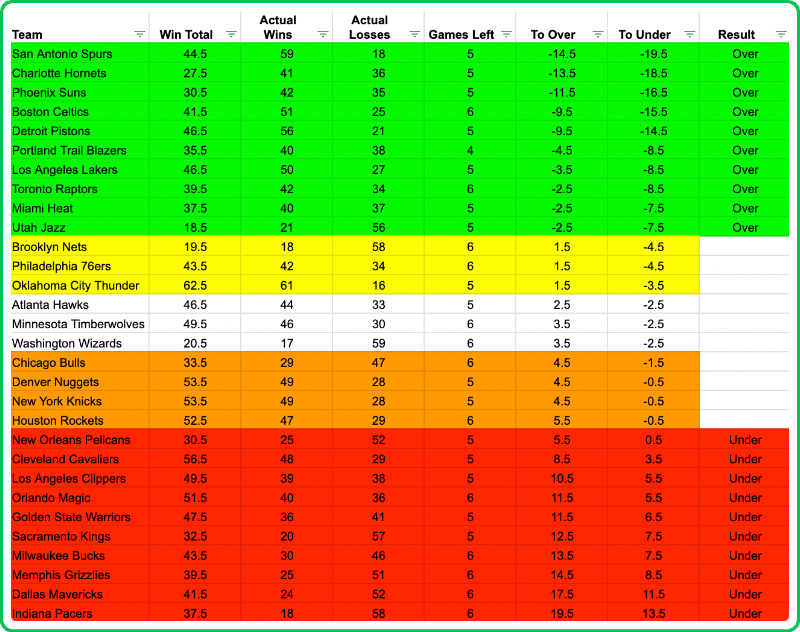 Let's take a look at our NBA regular season win totals over/under tracker as we head down the homestretch.