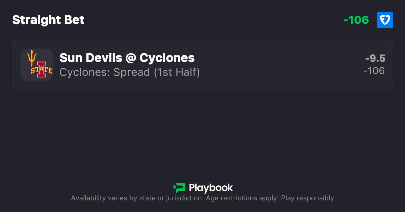 My Arizona State vs Iowa State best bet is on the Cyclones to cover the first-half spread. For all of your college basketball bets, be sure to find the best lines by using our live NCAAB odds page.