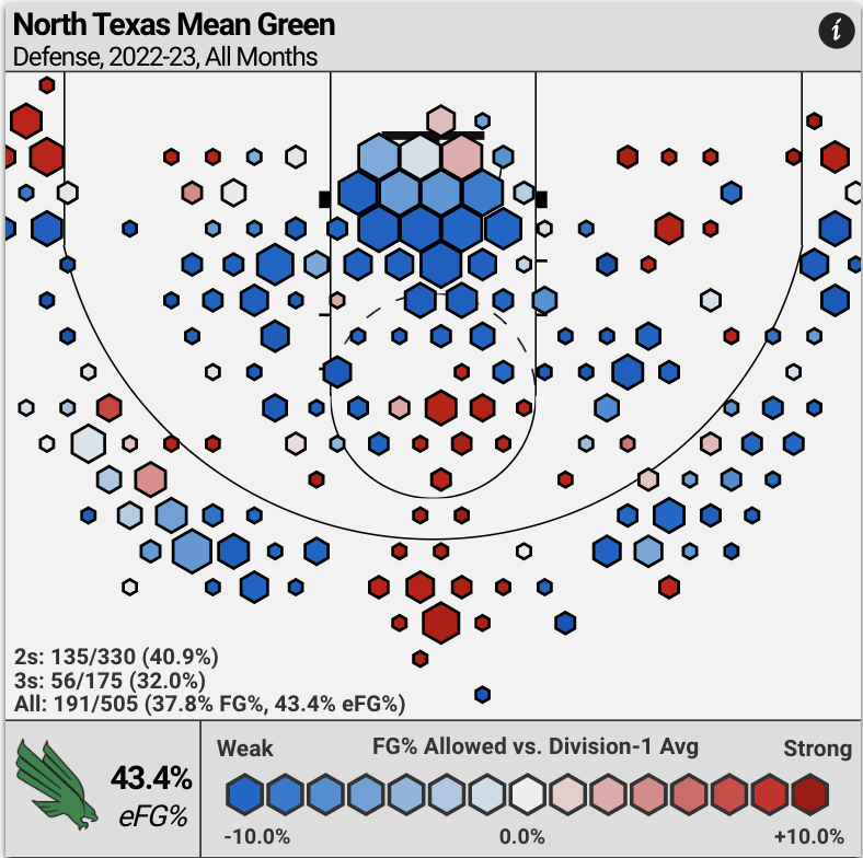 The Mean Green rank in the top 100 in Adjusted Offensive Efficiency, but they basically get to the foul line plenty and shoot a ton of 3s. They rank 42nd in 3-point attempt percentage, but are 224th (32.3%) in 3-point percentage.