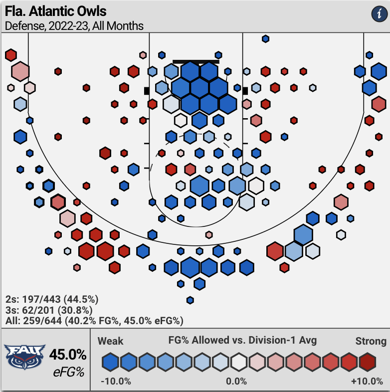This may be the only detriment to the FAU defensive approach because the Owls hold opponents to less than 30% from beyond the arc and 44.2% on 2-pointers.