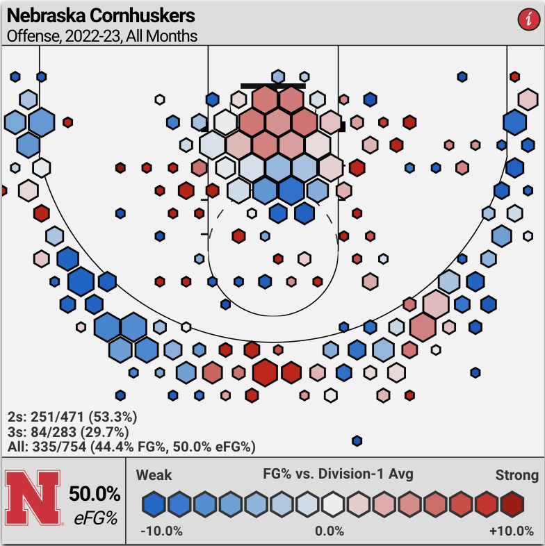 For example, Nebraska is allowing opponents to shoot around 49% on shots inside the arc and around 33% on shots outside. These are not the flashiest numbers.