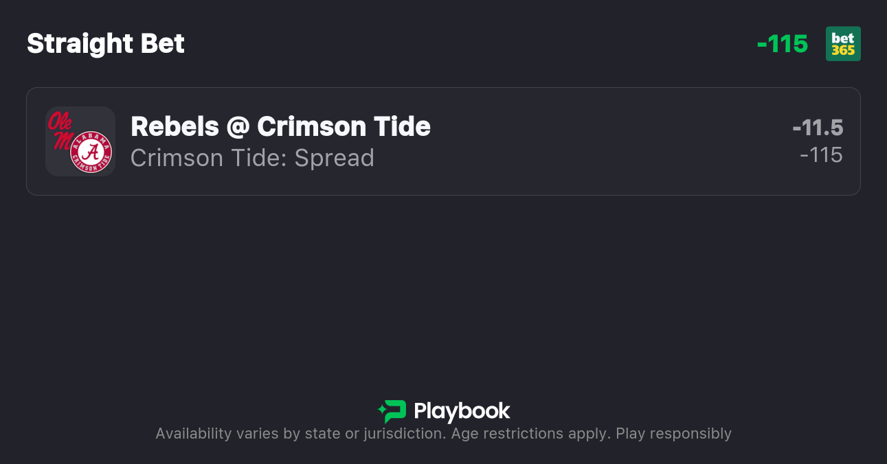 • Ole Miss vs Alabama spread: Alabama -11.5 (-115 ), Ole Miss +11.5 (-105)