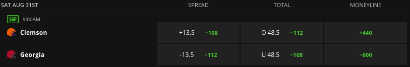 The other numbers (-108 and -112) are the price for each wager. If you bet $108 on Clemson and they win or lose by fewer than 13 points, you win $100. It costs a bit more ($112) to win $100 on Georgia. Most of the time, these numbers are at -110 for each side, but in big games like this one, we can see different prices due to the volume of wagers coming in on the game.
