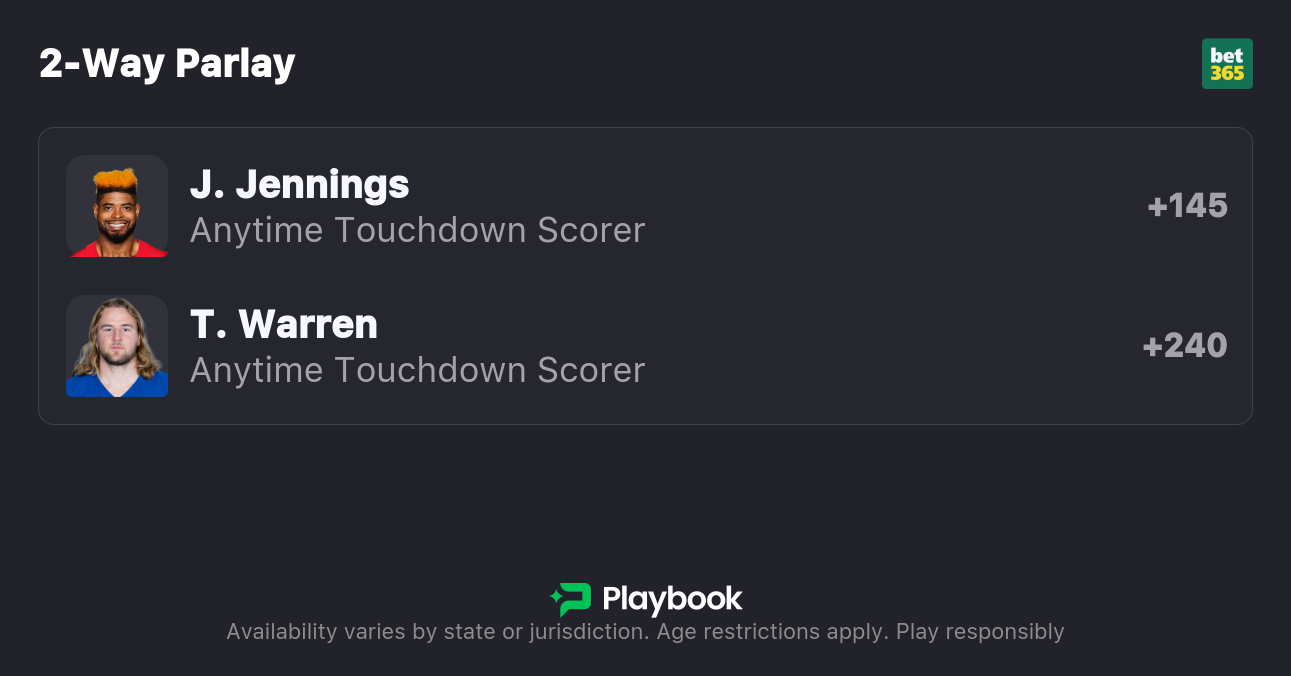 Purdy has been targeting both Jennings and George Kittle more than backup Mac Jones; Christian McCaffrey has also been getting less looks in the passing game — which is good news for Jennings here. Jennings has scored on 12.1% of his targets from Purdy compared to just 7.3% from Jones.