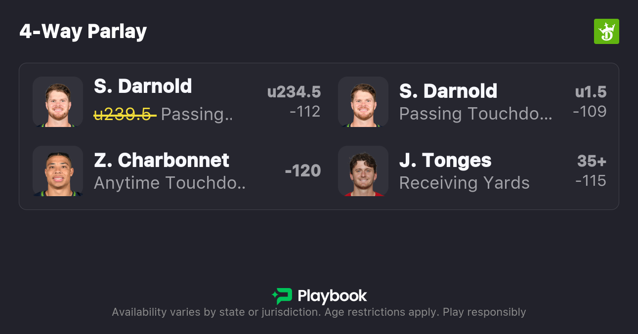 - Sam Darnold Under 1.5 Passing Touchdowns (-105 at Fanatics)