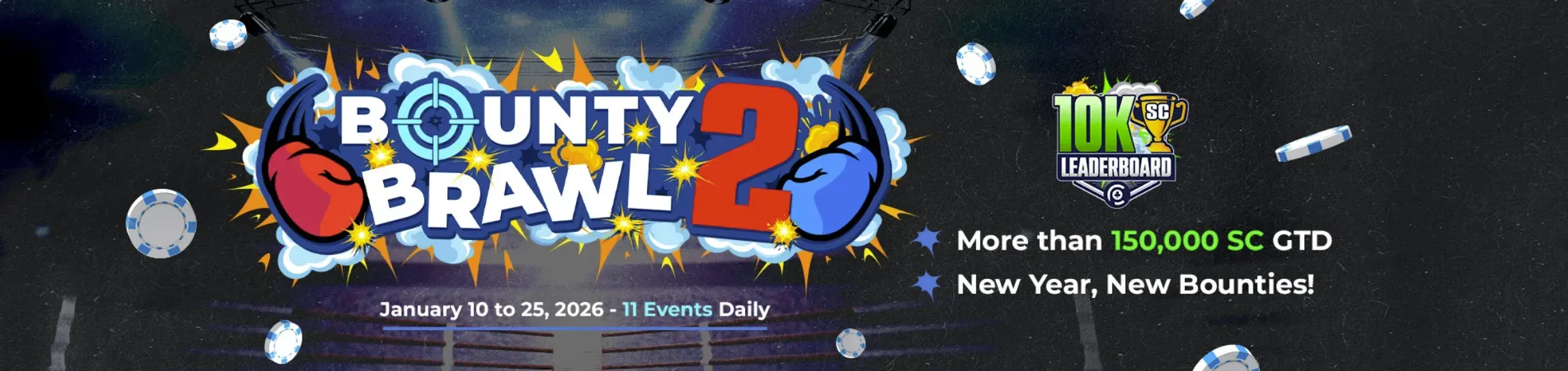 The Bounty Brawl tournament series, including events such as Bounty Brawl 2, features mystery bounty mechanics where eliminating opponents earns random Sweeps Coin prizes. Additional leaderboard rewards, including SC and exclusive items, are awarded to top performers, making eliminations just as valuable as chip accumulation.